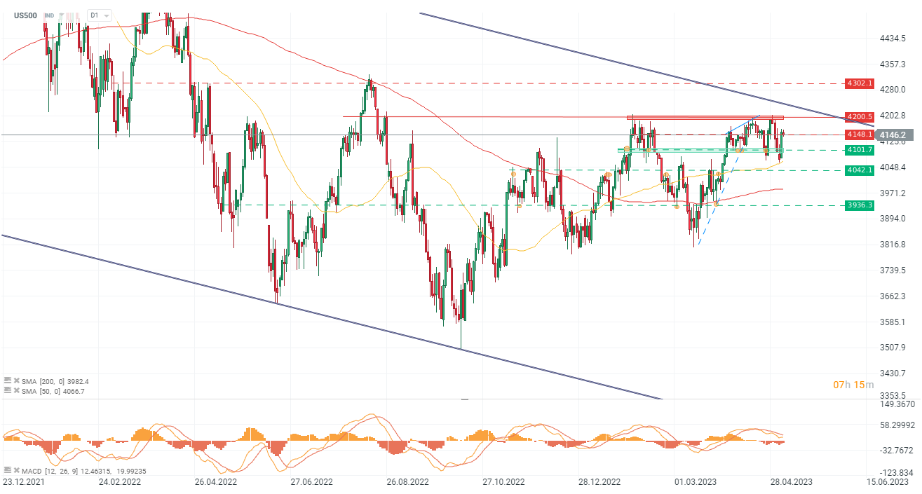 واجه مؤشر US500 ، الذي يتم تداوله حاليًا عند 4144 نقطة ، مقاومة في محاولته الأخيرة للاختراق فوق مستوى 4200 نقطة. تشير حركة السعر إلى أن المؤشر لا يزال داخل قناة سوق هابطة ، والتي تمثلها الخطوط الزرقاء الداكنة على الرسم البياني. يضعف الاتجاه الصعودي الأخير حيث يمكن ملاحظته على مؤشر MACD.