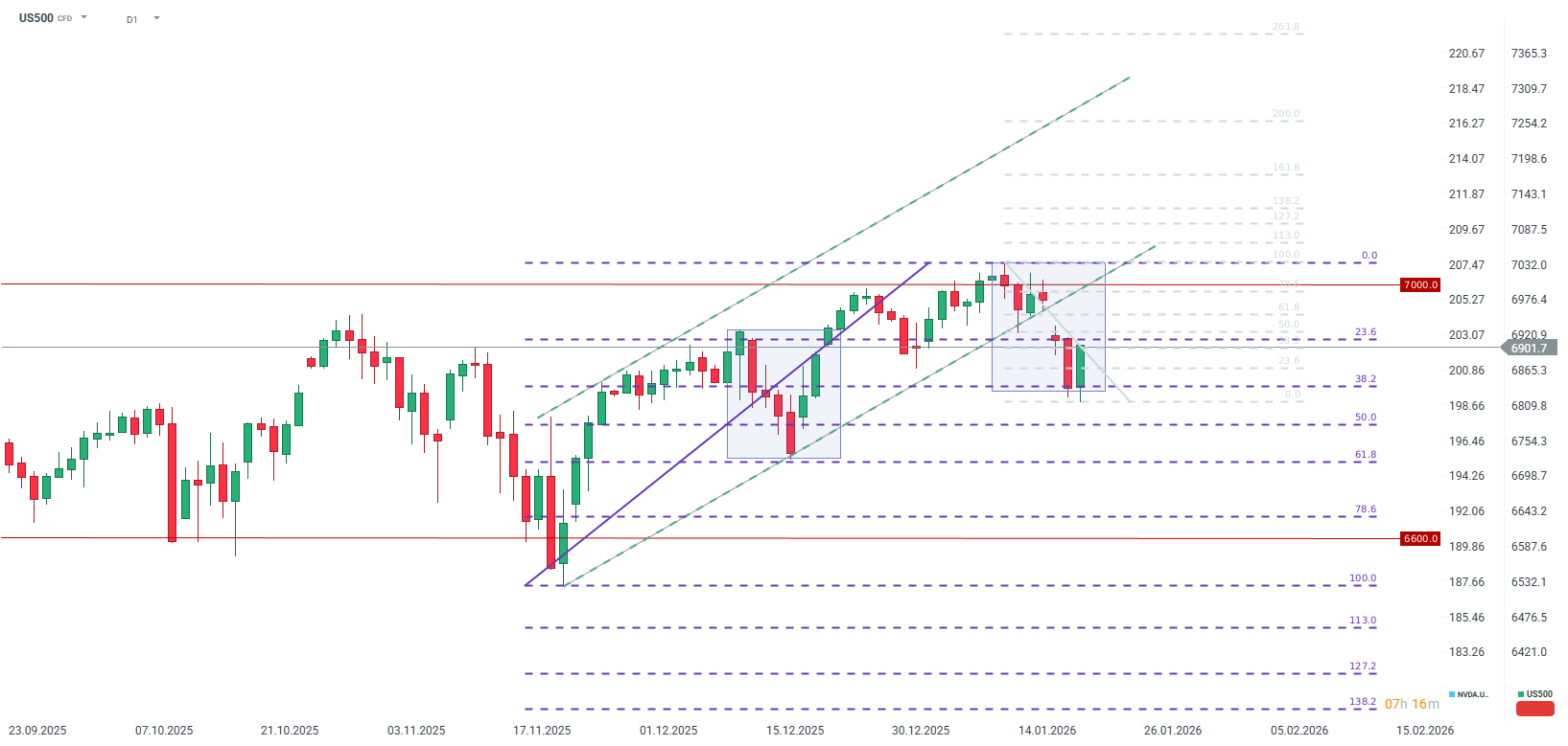 S&P 500 contracts have staged a robust recovery, trading near the 6,900 level and reclaiming approximately 0.7% following yesterday's sell-off. The current corrective phase matches the magnitude of the December pullback. Bulls are likely eyeing resistance at 6,930, which aligns with the 50.0 retracement of the current correction and the weekend opening gap. Conversely, should the downward trend resume, sellers will look toward the 50.0 and 61.8 retracement levels of the major rally that began in November.