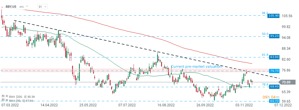 Best Buy (BBY.US) stock rose sharply in premarket and is currently testing a major resistance zone around $76.70, which is marked with previous price reactions and downward trendline. Should a break higher occur, upward move may accelerate towards resistance at $83.90 which coincides with 61.8% Fibonacci retracement of the upward wave launched in March 2020. On the other hand, if sellers manage to regain control, nearest support to watch is located at $68.40. Source: xStation5