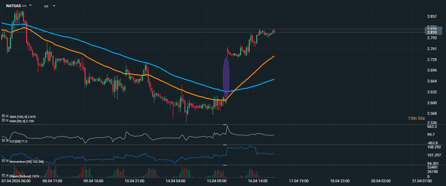 Aktuálně se zemní plyn obchoduje v blízkosti 2,81 USD, tedy nad klouzavými průměry EMA 50 na 2,739 USD i SMA 100 na 2,670 USD, což potvrzuje zlepšené krátkodobé technické nastavení. Po vytvoření cenového gapu se na trhu rozvinul růstový trend, který cenu posunul výrazně výše. CCI se pohybuje kolem hodnoty 71, což ukazuje na stále pozitivní momentum, ale bez extrémní překoupenosti. Také Momentum 102,368 potvrzuje, že kupci mají zatím navrch, i když v posledních hodinách je vidět spíše zpomalení růstu a přechod do užší konsolidace. Objem obchodů není extrémní, což může znamenat, že trh nyní čeká na nový impuls pro rozhodnější pohyb.
