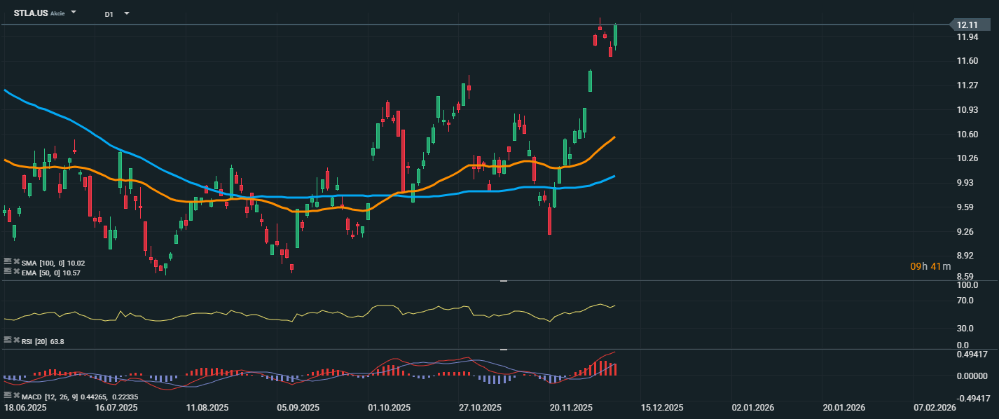 Akcie automobilky Stellantis v posledních dnech zažívají prudký růst a aktuálně se obchodují na úrovni 12,11 USD, což představuje nové několikaměsíční maximum. Technicky je trend jasně býčí – cena se nachází výrazně nad oběma klouzavými průměry, EMA 50 (10,57 USD) a SMA 100 (10,02 USD), které navíc začínají směřovat vzhůru, což značí obrácení trendu ze sestupného na rostoucí. RSI dosahuje hodnoty 63,8, tedy se blíží překoupenému pásmu, ale stále ponechává prostor pro další růst.