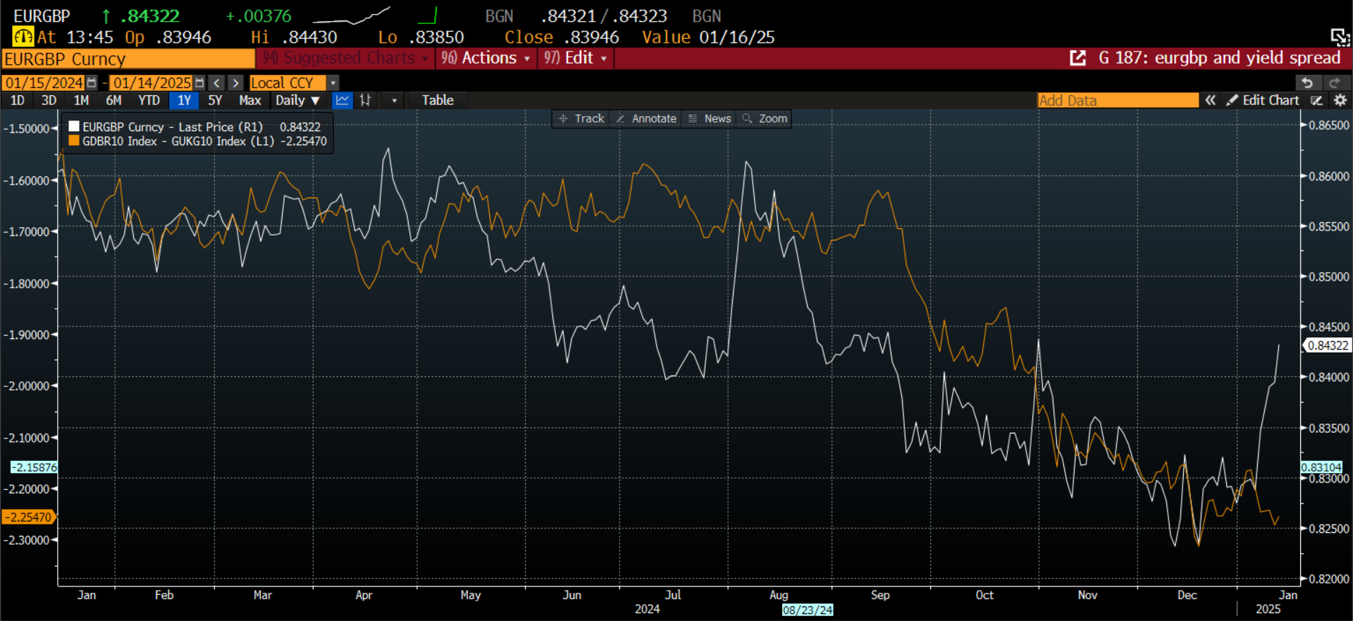 As you can see, this FX pair is tracking the yield spread closely. As the yield spread narrows: i.e, UK yields fall back towards German yields, this is positive for EUR/GBP.
