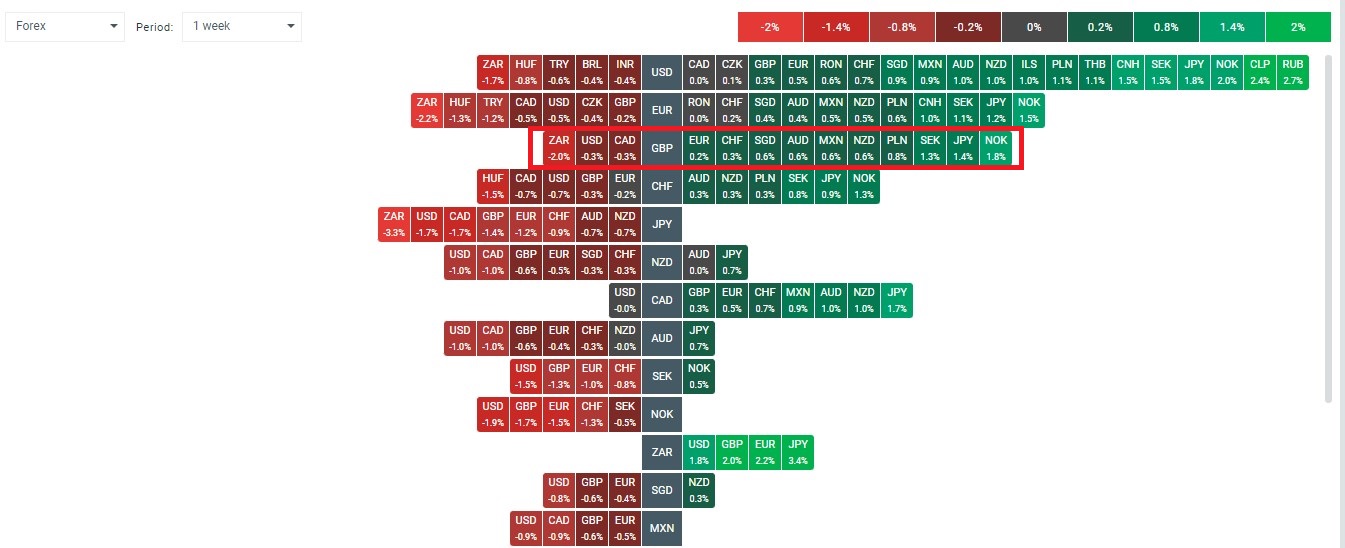 Chart - Heatmap of GBP performance against most major currencies in May 2023