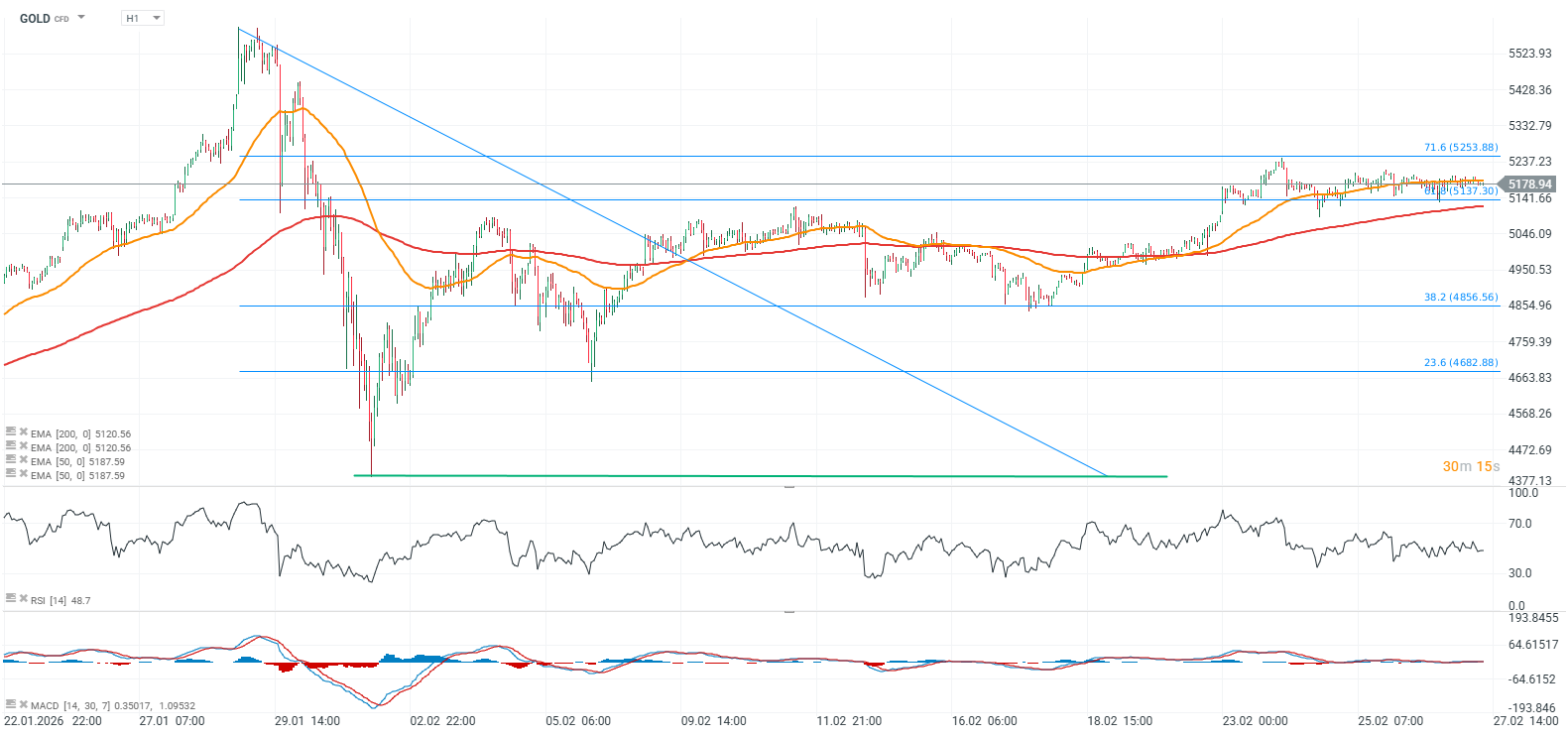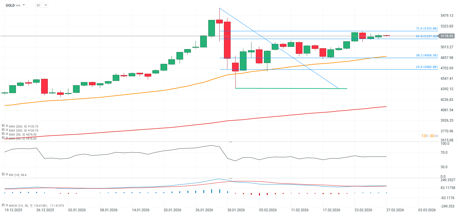Despite the strength of the US dollar, gold is holding near $5,200 per ounce, which means the pullback from the all-time high around $5,600 currently stands at roughly 8%. Ongoing global geopolitical tensions, continued purchases and reserve diversification by central banks, and strong demand for hedging amid a global equity bull market all appear to be supporting gold’s fundamental demand. Similarly, robust retail investor interest in Asia is sustaining marginal demand for the metal, both in physical form and via ETFs. Looking at the GOLD chart, we can see that the price recovered relatively quickly from the late January–early February crash and is now attempting to return to record levels.