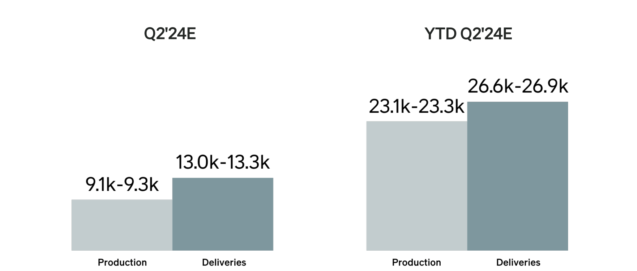 Today, as part of Investor Day, Rivian presented its plans for the coming years. The company reinforced its prediction of producing 57 thousand units in 2024, which would mean a 5% year-on-year increase. As of 2Q24, the company expects to produce between 9.1-9.3 thousand units and 13-13.3 thousand deliveries.