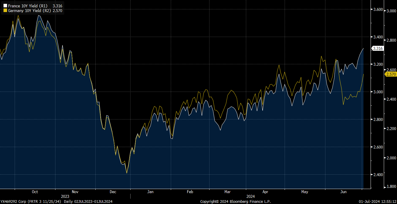 Whether the RN achieves an absolute majority or not, the French political landscape remains uncertain. In the absence of a clear majority, forming a government will require significant compromises to ensure stable governance. This political uncertainty also raises critical questions for the French economy and, by extension, for European financial markets. Can a government of an EU member state still afford to increase public spending, leading to higher deficit and debt?