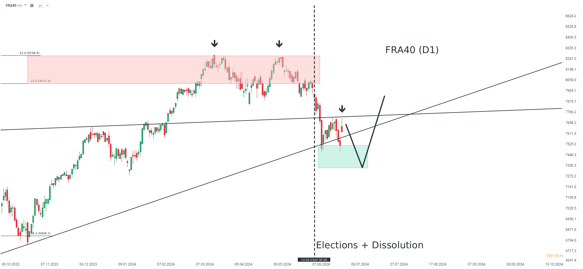European indices experienced a significant boost this morning following the results of the first round of the legislative elections in France, as investors seem confident the radical right will hold no absolute majority. Shortly after the market open, the CAC 40 exhibited a strong upward movement, rising by 2.42%, which in turn lifted the EuroStoxx 50 and the DAX. However, two hours later, the French index pulled back to a performance of 1,52% as investors digested the market event. The euro also saw a substantial increase of 0.46%.