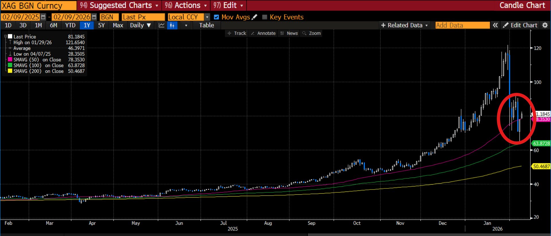 However, on the other hand, there are reasons to be positive. Geopolitical tensions are reduced. Talks between Iran and the US have been positive so far, and Polymarket is now predicting a 40% chance that the US will strike Iran by the end of March, which is well below the peak. This could reduce near-term spikes in the oil price. Added to this, the shake-out in gold and silver that we have seen in recent weeks could be at an end, especially now that silver has broken above its 50-day sma at $77.85. This suggests that short term momentum is to the upside.