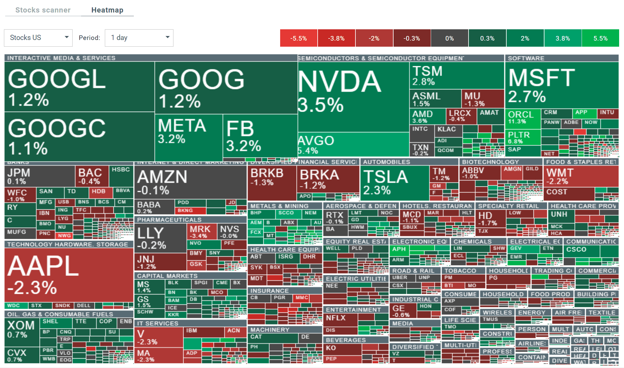 Sentiment at the end of the day in Europe and in the second phase of the Wall Street session is clearly improving. The US100 contract is already up more than 1%, while the US500 and US2000 are up 0.7% and 0.8% respectively. Today's gains are primarily driven by large-cap technology companies. Shares in companies such as Oracle, Palantir and Applovin are gaining between +7% and +15%. At the same time, Nvidia is up 3.5% and Broadcom 5.4%.