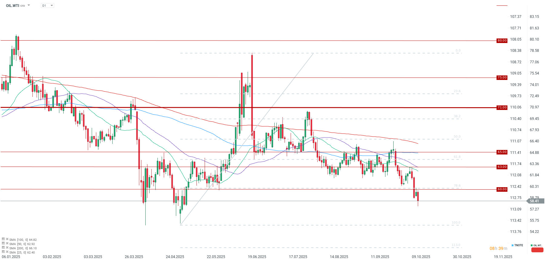The market appears convinced of a major oversupply in the coming year and beyond. We are currently observing a relatively clear contango in the forward curve from next February. Up until February, there is only a slight backwardation of just 1%. The price is also approaching a minor roll-over point, which should bring the price closer to $57.5 per barrel.