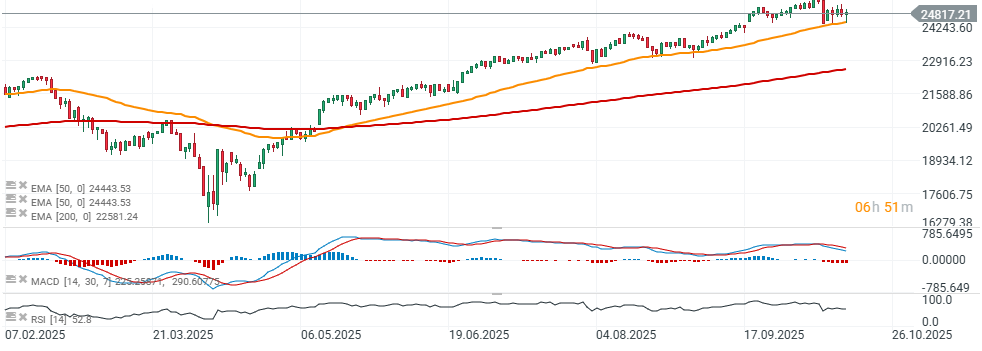 Los índices estadounidenses registran leves alzas este viernes, con los bancos regionales recuperándose lentamente tras las recientes caídas. El índice Nasdaq 100 sube un 0,1%, manteniéndose por encima de la media móvil exponencial (EMA) de 50 días (línea naranja).