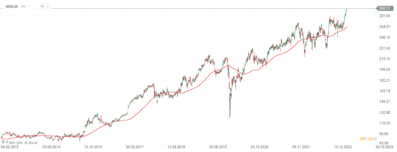 Gráfica de McDonald's (MCD.US), intervalo D1. Las acciones abrirán hoy en su nivel más alto cerca de los 300$. Fuente: xStation5