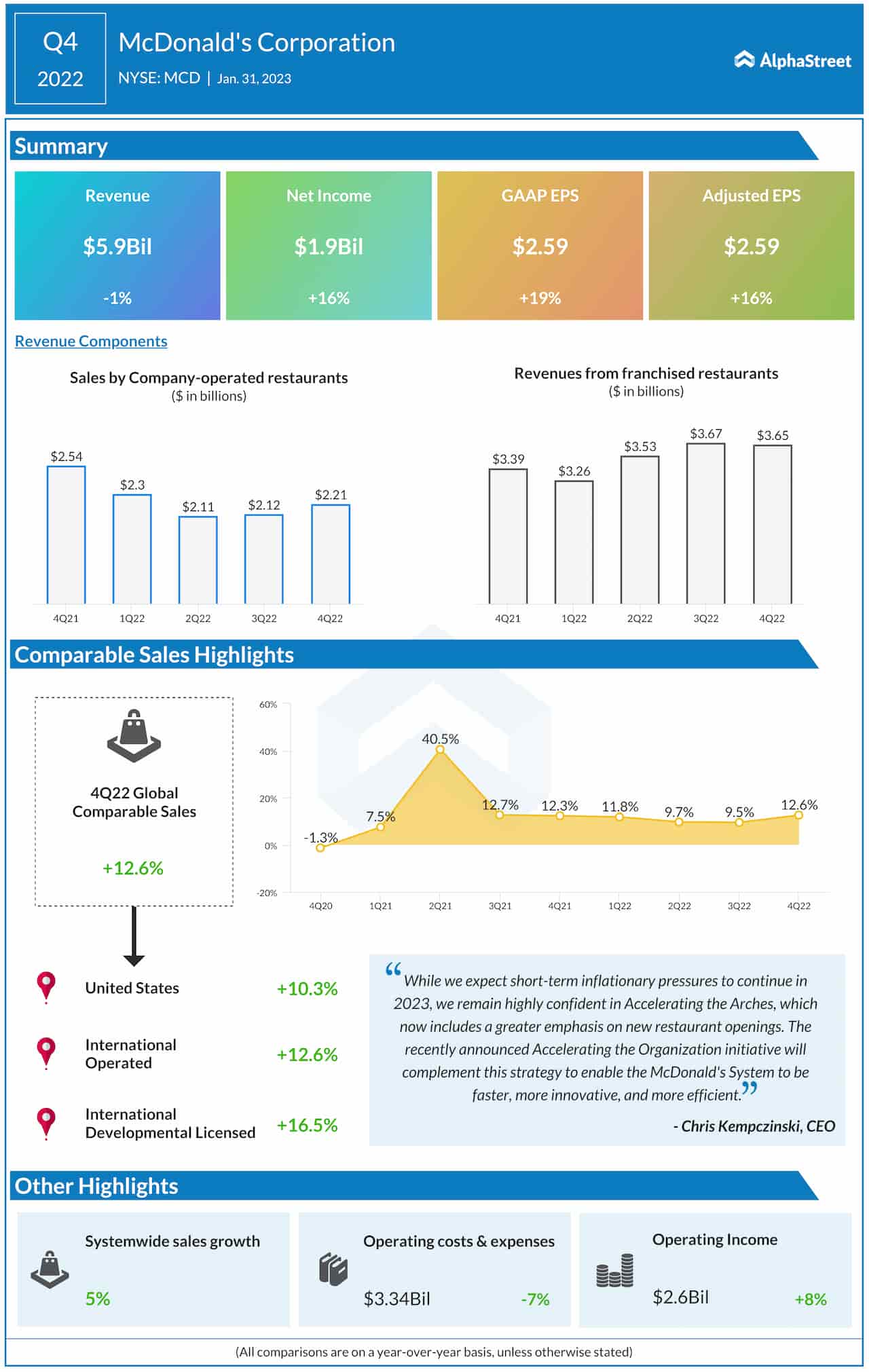 - “Nuestra estrategia Accelerating the Arches está impulsando el crecimiento y fortaleciendo la marca, brindando un rendimiento anual excepcional en 2022 con un crecimiento de ventas comparable de más del 10 % y un crecimiento del número de invitados comparable del 5 % a nivel mundial”, dijo el presidente y director ejecutivo de McDonald’s, Chris Kempczinski. “Si bien esperamos que las presiones inflacionarias a corto plazo continúen en 2023, seguimos confiando mucho en Accelerating the Arches, que ahora incluye un mayor énfasis en la apertura de nuevos restaurantes. La iniciativa Accelerating the Organization recientemente anunciada complementará esta estrategia para permitir que el Sistema McDonald's sea más rápido, más innovador y más eficiente. Estamos orgullosos de nuestro sólido desempeño continuo, pero no estamos satisfechos. Ese es el sello distintivo de McDonald's”.