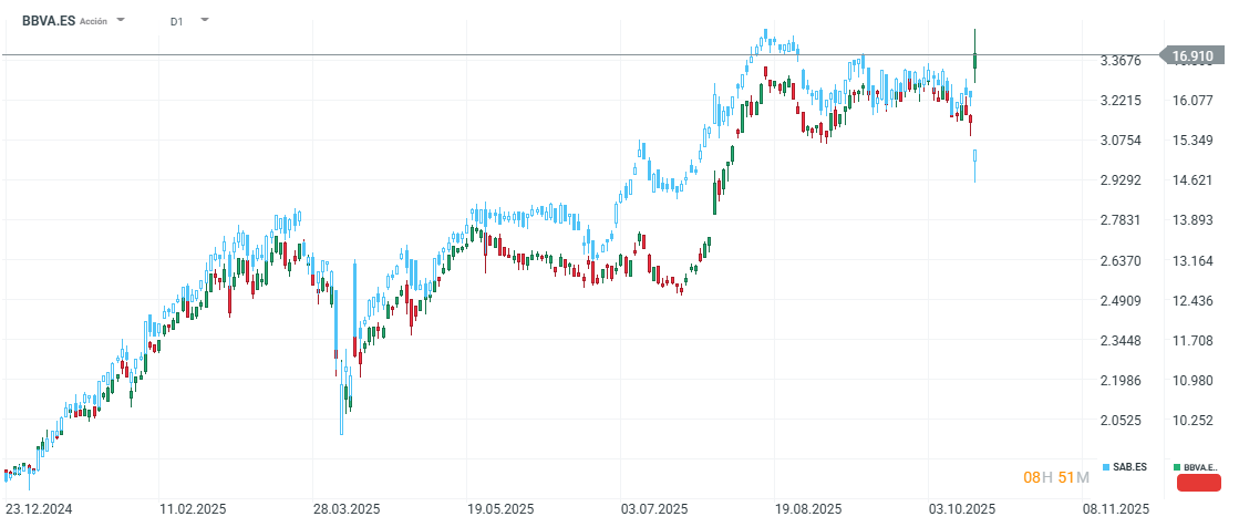 Las acciones de BBVA (velas verdes y rojas) suben un 78% en este 2025, mientras que las de Sabadell (velas azules y blancas) suben un 60%.