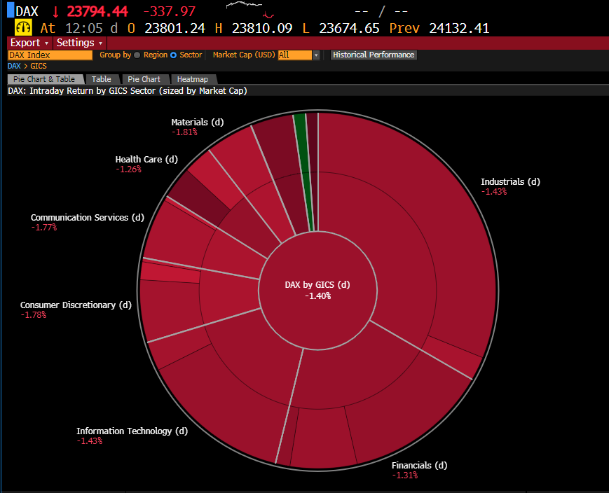Vers la mi-journée, le DAX mène les baisses, avec des contrats à terme en recul de 1,3 %. Le CAC 40 affiche également une performance négative, tandis que les indices espagnol (SPA35) et italien (ITA40) reculent d’environ 1 %. Les FTSE 100 et WIG20 s’en sortent un peu mieux, leurs pertes se limitant à environ 0,8 %.