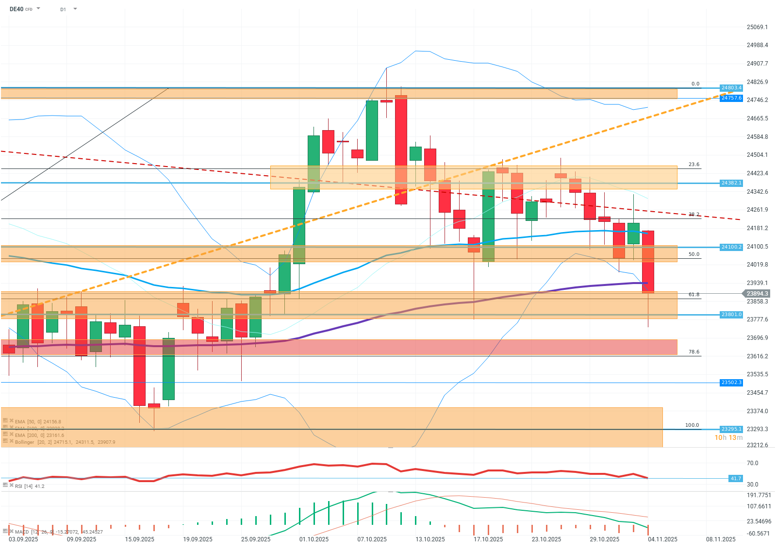 Pour les acheteurs, il est essentiel de préserver le niveau des 23 800 points, avant de viser un retour vers 24 100. En revanche, si le niveau de Fibonacci 61,8 ne parvient pas à être défendu, le prochain support se situe autour de 23 600 points, correspondant au niveau de Fibonacci 78,6.