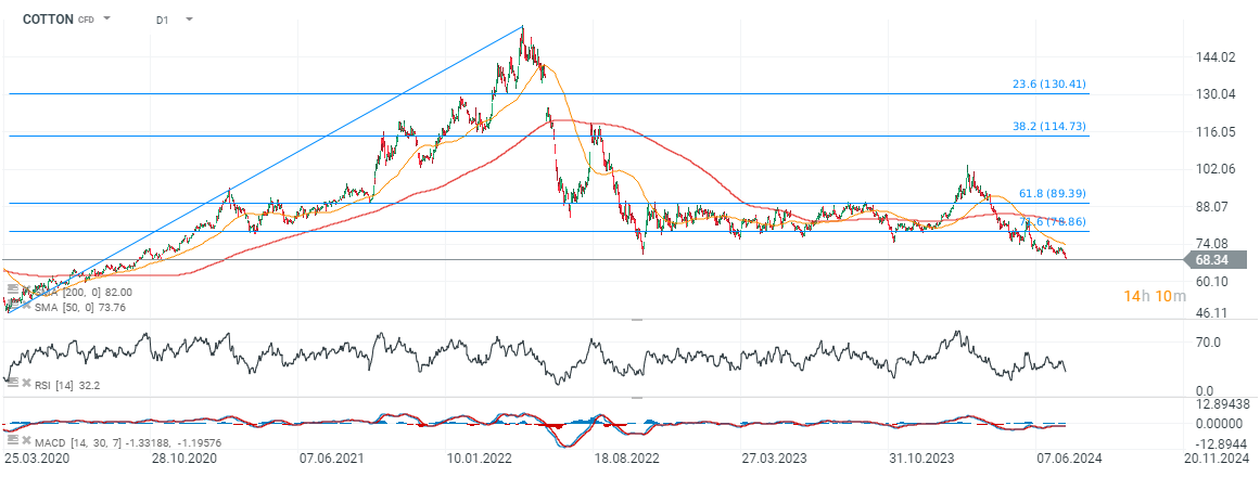 Les contrats à terme sur le coton sont dans une forte tendance baissière et ont déjà perdu près de 65% depuis les sommets atteints en 2022 près de 160$. La dernière réaction significative des prix depuis 2020 est proche de 60$.