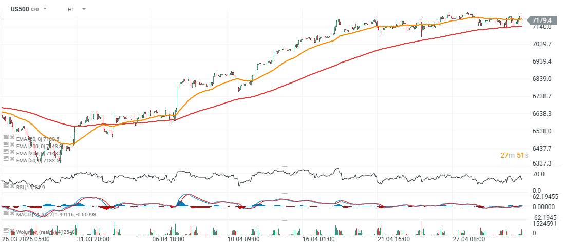 Si l'on examine le graphique de l'US500, le contrat tente de se maintenir au-dessus de la moyenne mobile exponentielle à 200 périodes (EMA200) sur la période horaire, le niveau de 7 140 servant de zone de soutien clé. Il convient de noter que Wall Street continue d'anticiper une nouvelle amélioration. Les prévisions consensuelles pour les marges nettes du S&P 500 s'établissent à 14,1 % au deuxième trimestre, 14,6 % au troisième trimestre et 14,6 % au quatrième trimestre 2026. Ces hypothèses semblent relativement optimistes compte tenu des signaux mitigés provenant de la vigueur de la consommation américaine.