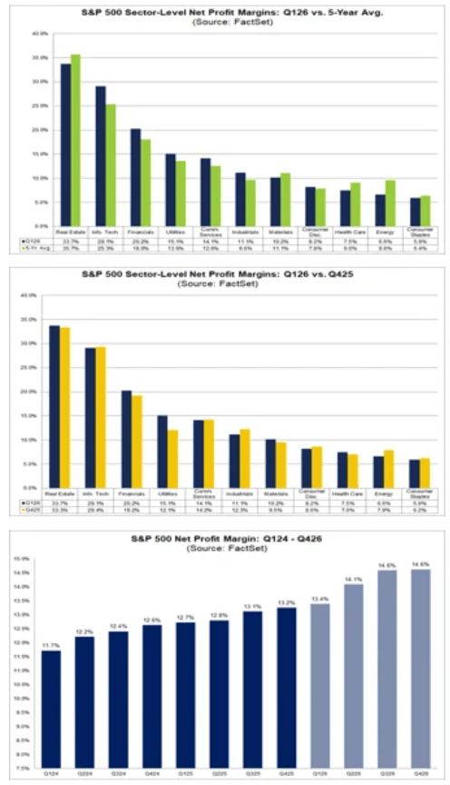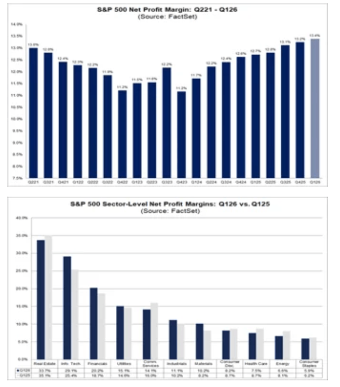 • S&P 500 : La marge bénéficiaire nette pour le premier trimestre 2026 s'établit à 13,4 %, dépassant le précédent record de 13,2 % atteint au quatrième trimestre 2025.