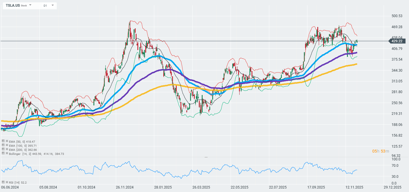 L’action TSLA maintient sa tendance haussière de long terme après être repassée au-dessus de sa moyenne mobile exponentielle à 50 jours (courbe bleue sur le graphique) la semaine dernière. Source : xStation