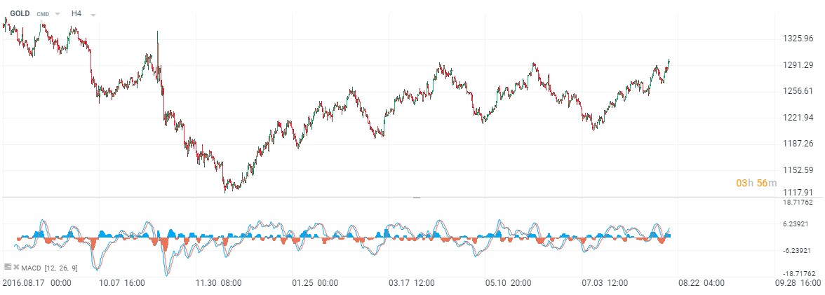 Le signal d’achat MACD est généré quand le MACD (la ligne bleue) traverse au-dessus de la ligne de signal MACD (la ligne rouge). Similairement, quand MACD traverse au-dessous de la ligne de signal MACD, un signal de vente est généré. On pourrait aussi placer des ordres basées sur MACD quand la ligne bleue traverse la ligne zéro. Alors, le signal d’achat est généré quand la ligne bleue traverse au-dessus de la ligne zéro et le signe de vente quand elle traverse au-dessous.