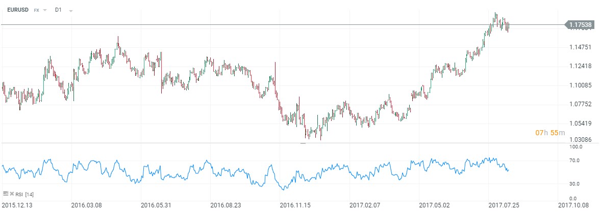 D’autre coté, si le RSI tombe entre 70 et 100 de l’échelle il est considéré comme survendu. Le signal suggère que le niveau de résistance pour un certain actif est proche ou il a été atteint et le taux va probablement tomber ; les traders interpréteraient cela comme une opportunité de vente. Par exemple, si vous voyez que le RSI pour l’EURUSD a augmenté au-dessus de 70, un signal de vente est généré et vous pourriez vendre la paire.
