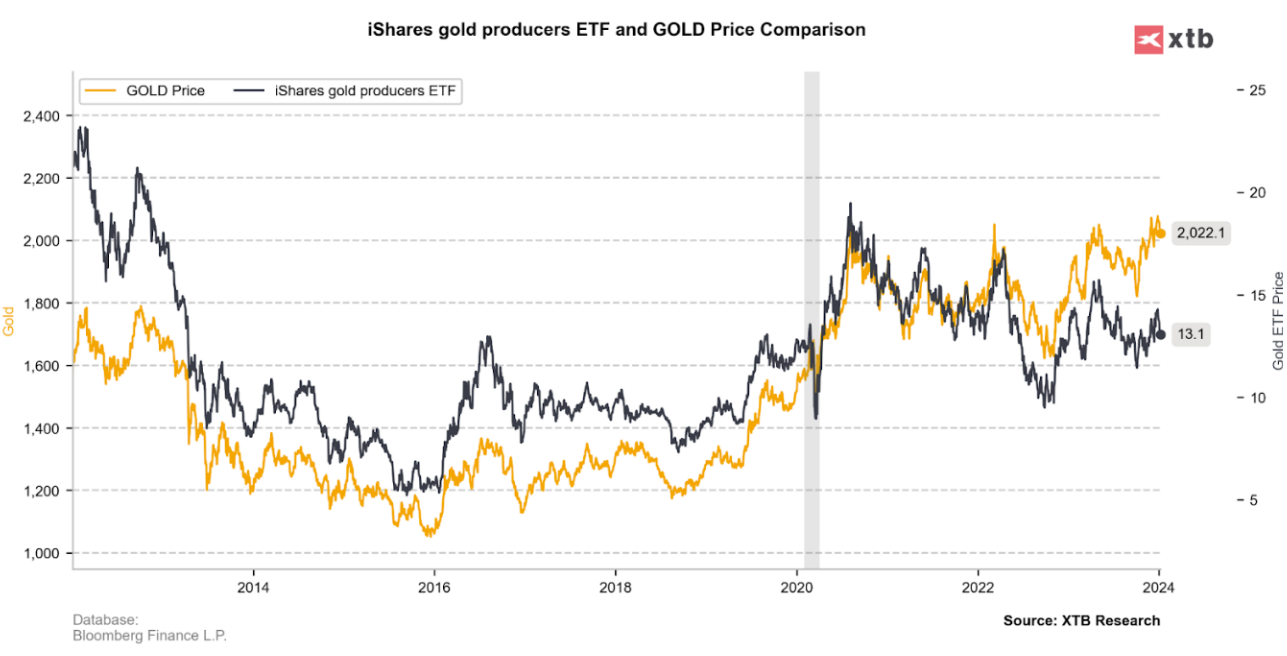 Comparaison de l’ETF iShares gold producers IAUP.UK avec les prix de l’or. Après la crise du Covid-19 en 2020, les deux font état de très bonnes performances, mais l’ETF s’est montré beaucoup plus vulnérable que l’or lors de l’effondrement des actions. Source : XTB Research