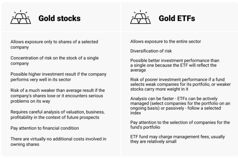 - Investir dans l’or sous la forme d’actions ETF or signifie que tout investisseur peut choisir de diversifier son portefeuille de sociétés minières sans s’exposer aux risques que représente un investissement dans une seule entreprise (notons qu’un investissement, quel qu’il soit, représente toujours un risque).