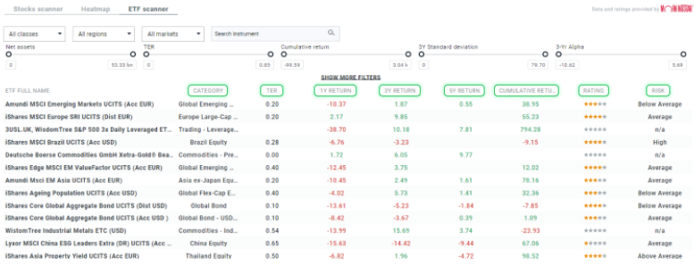 Les titulaires d’un compte d’investissement sur XTB ont accès au « scanner ETF » de la plateforme. Ce dernier est basé sur les données partagées de la célèbre plateforme Morningstar. Grâce à cet outil, vous disposez d’une aide précieuse pour effectuer vos recherches sur les ETF, ainsi que vos analyses de marché. Ce scanner ETF peut vous faciliter la sélection, l’analyse et la recherche d’ETF pour investir dans l’or de manière plus éclairée. Parmi les facteurs pris en compte, vous retrouverez :