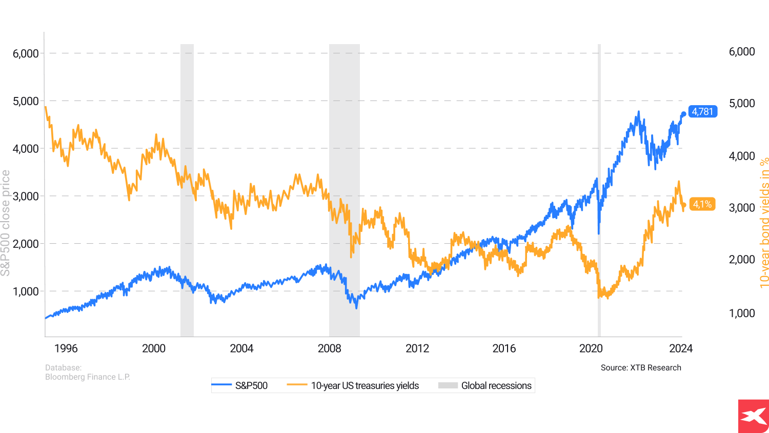 A 10 éves amerikai államkötvények hozamai a korábbi recessziók során csökkentek. A részvénypiac (itt az S&P 500 index) szintén mélyült a visszaesés az amerikai gazdasági lassulás során. A fix kamatozású eszközök nem különösebben vonzóak egy jelentős gazdasági lassulás során a jegybanki politika galambszerű változása (a gazdaság kisegítése) miatt. Ugyanakkor, amikor a gazdaság erősebb, a részvénypiac általában felülmúlja a fix jövedelmű eszközök teljesítményét (de ez soha nem garancia). A legfontosabb tanulság, hogy a fix jövedelmű eszközök, például az amerikai állampapírok nem olyan jók, mint mindig és mindenkor, de kielégítő hozamot biztosíthatnak a befektetőknek, amikor az infláció magas és a központi banki politika sokkal sólyomibb. A befektetés célja a magasabb hozam elérése (magasabb kockázatú, agresszív portfólióval). A fix kamatozású eszközök célja a pénz vásárlóerejének megőrzése, hosszú távon (minden, ami e fölött van, felár), a nemteljesítés nagyon kis kockázata mellett (defenzív portfólió). Forrás: XTB Research, Bloomberg Finance LP