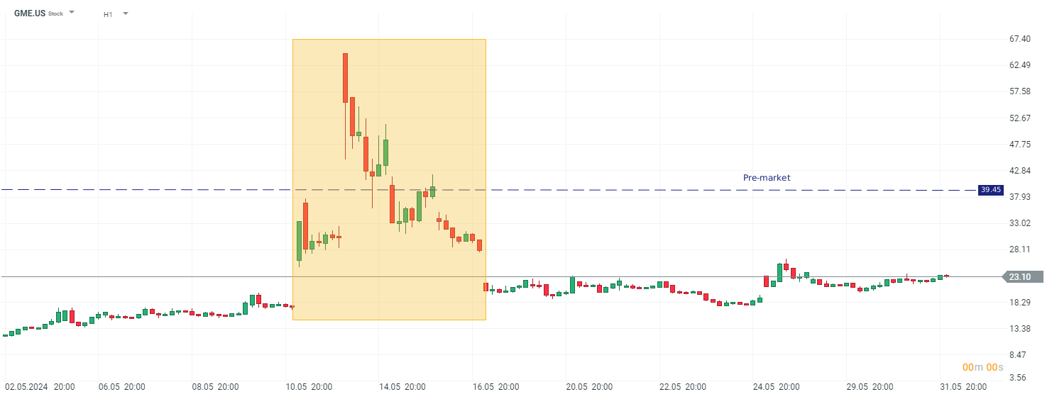 A GameStop májusi rallyja már 5 nap után véget ért (sárga négyzet a grafikonon). A felfelé irányuló mozgás a piac előtti időszakban még mindig kevésbé erős, mint az előző. A részvények árfolyama 2021-ben még drasztikusabban emelkedett, 120 dollár fölé jutva. Forrás: xStation