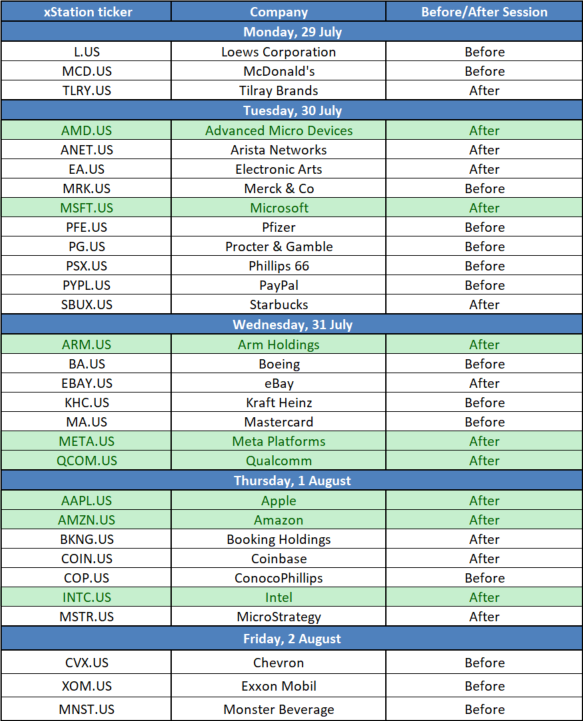 Az előttünk álló hét tele van magas szintű makroeseményekkel, mint például az amerikai munkahelyi adatok közzététele vagy a Fed, a Bank of Japan vagy a Bank of England kamatdöntése. Ugyanakkor az előttünk álló hét eredménynaptára is tele van az amerikai vállalatok, köztük számos nagy technológiai részvény közzétételével. Az e heti kiemelt eredmények között megtalálhatók