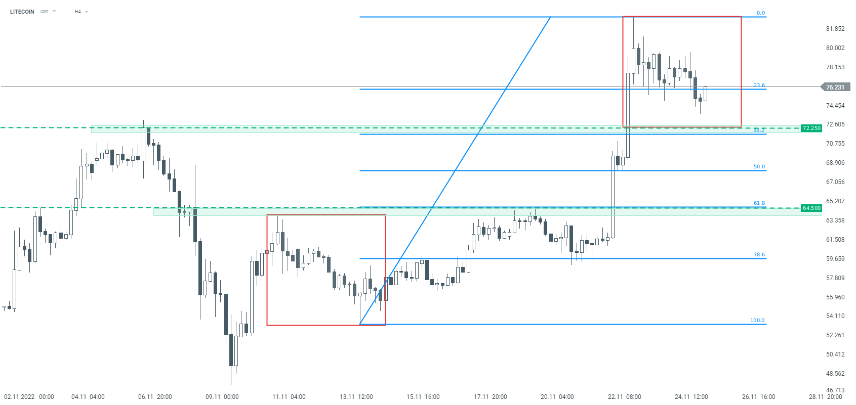 Osservando il grafico di Litecoin sull'intervallo H4, possiamo osservare una situazione tecnica interessante. Dopo il recente forte movimento al rialzo, ha iniziato una correzione, che nella sua forma ed estensione assomiglia alla precedente - dall'11 al 14 novembre. I presupposti dell'analisi tecnica dicono che la zona al livello di 72,25 rimane il supporto principale. Questo è dovuto al limite inferiore della struttura 1:1, e 38,2% di Fibonacci e il massimo locale precedente. Finché il prezzo è al di sopra, è possibile la continuazione del rialzo. D'altra parte, se venisse superato il supporto potrebbe portare a ribassi maggiori, nel qual caso i livelli di Fibonacci 50 e 61,8 dovrebbero essere considerati ulteriori supporti.