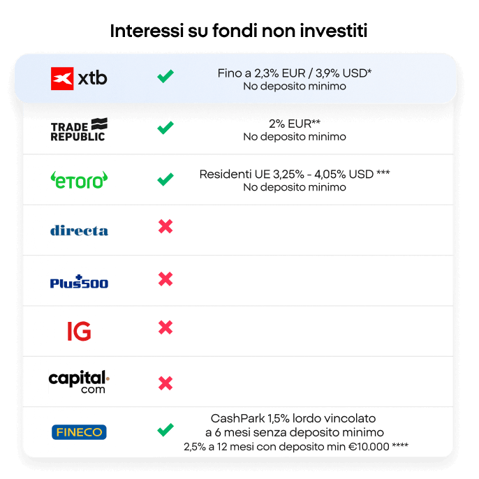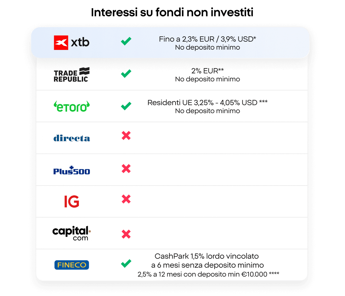 **** Disponibile solo a determinate condizioni: richiede un deposito minimo di 10.000 €, un vincolo CashPark di 12 mesi, la sottoscrizione di un PAC in fondi collegati e deve essere effettuato tramite un consulente finanziario. I tassi sono aggiornati alla data indicata nella tabella. Dati disponibili al 23/10/2025*