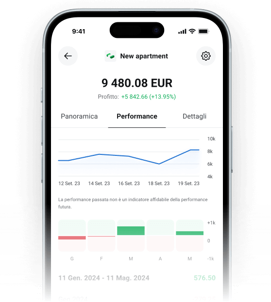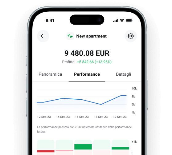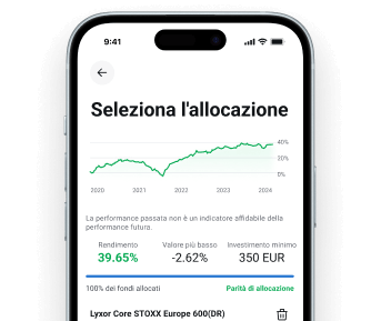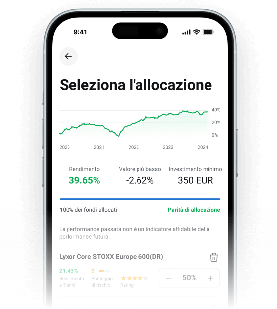 L'interfaccia intuitiva ti permetterà di costruire facilmente il tuo piano e di investire un importo specifico, a partire da 15 euro. Gli strumenti finanziari che offriamo sono rischiosi. Investi in modo responsabile.
