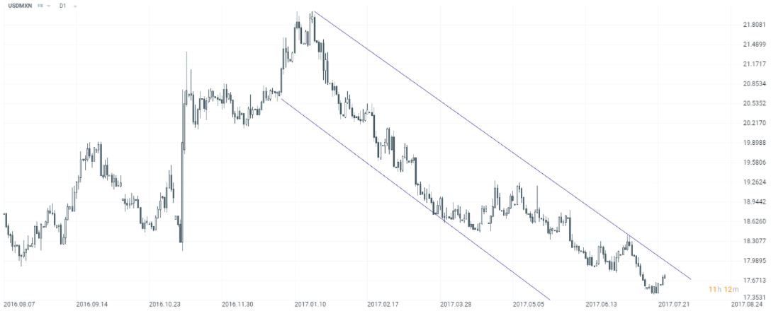 El USDMXN ha estado en una tendencia a la baja desde comienzos de 2017. La primera mitad de ese año trajo una disminución sólida del par que terminó por consolidar su tendencia bajista. Lo que es más, una posición de venta entrega un swap positivo, por lo que el beneficio de esa operación sería aún mayor. El mercado está en tendencia, el swap es positivo - carry trade funciona perfectamente.
