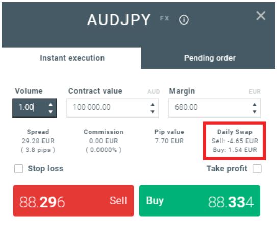 Como se puede ver, xStation 5 calcula el valor diario dependiendo de la posición que toma y el volumen de su trade. En este ejemplo, la posición de compra en la cotización AUDJPY dará aproximadamente 1,5 euros al día para cada lote. Así que si usted mantiene la posición durante un año, obtendrá alrededor de 540 EUR sólo con el carry trade. Si el mercado se mueve en su contra, su ganancia o pérdida será la diferencia entre la ganancia mencionada y una pérdida de los movimientos del mercado. Por otro lado, si el par se mueve en la misma dirección de su operación, obtendrá una ganancia adicional.