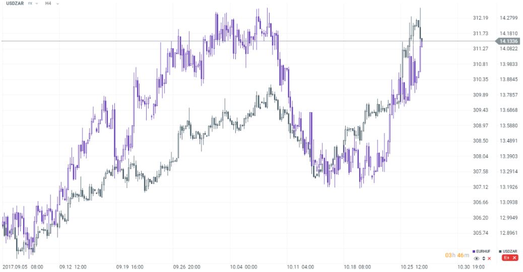 Además, podría darse la situación en la que dos divisas de economías completamente diferentes se comporten de la misma manera. Por ejemplo, veamos el mercado de divisas emergentes. El Florin Húngaro (EURHUF) se ha movido en la misma dirección que el Rand sudafricano (USDZAR). Son divisas completamente diferentes , de diferentes países con diferentes economías. Entonces, ¿por qué se comportan así? . La cesta de divisas emergentes es la respuesta. Las divisas emergentes tienden a depreciarse cuando el sentimiento general de mercado se deteriora y tienden a apreciarse cuando el sentimiento es optimista.