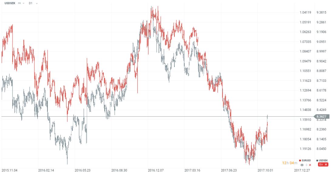 Es por ello que la Corona Sueca se comporta de forma similar a la divisa europea y es por ello que el USDSEK se comporta parecido al EURUSD. Aún así hay que recordar que hay una correlación negativa entre el EURUSD y el USDSEK. Cuando el EURUSD se aprecia, generalmente vemos como el USDSEK se deprecia. Tanto el EUR como el SEK se comportan de la misma forma, es por eso que los cruces se comportan de forma contraria. A esto lo llamamos correlación negativa.