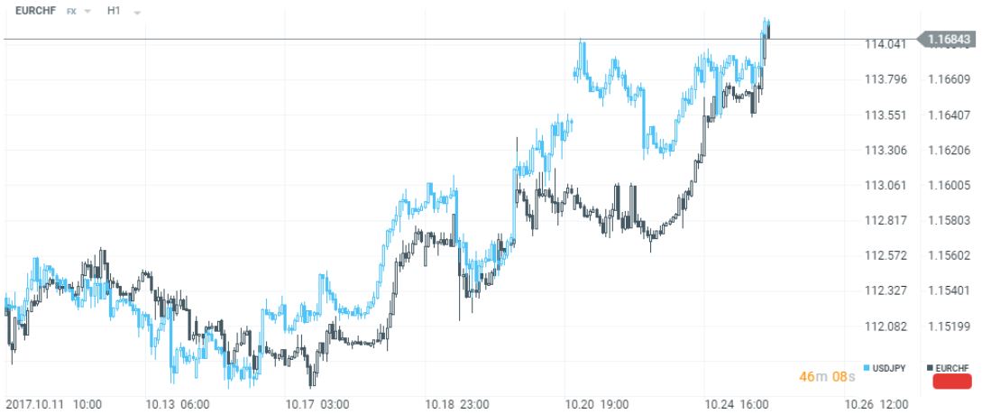 Como se puede ver en el gráfico, vemos una correlación muy nítida entre el USDJPY y el EURCHF. Son dos pares de divisas diferentes, cuatro divisas en sí completamente independientes, pero sin embargo se mueven siempre con una correlación entre ellas. En este caso la correlación es positiva, ya que ambos pares se mueven en tandem. Si una divisa se aprecia, la otra replica el movimiento y viceversa. Por supuesto podemos observar que a veces se produce una desviación. No es una ciencia exacta, pero en este ejemplo en particular vemos una correlación fuerte como resultado de un factor de riesgo que juega un papel principal en el caso del JPY y del CHF. Cuando el apetito de riesgo crece, los traders venden tanto JPY como CHF. Es por ello que el par USDJPY y el par EURCHF crecen al mismo tiempo.