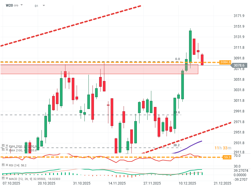 Cena na wykresie przedłuża korektę spadkową, oddalająć się od szytu na poziomie 3151 punktów. Kurs znajduje się w kluczowym punkcie, kupujacy muszą obronić poziom FIBO 0, poprzedni szczyt, aby zapobiec dalszej przecenie.