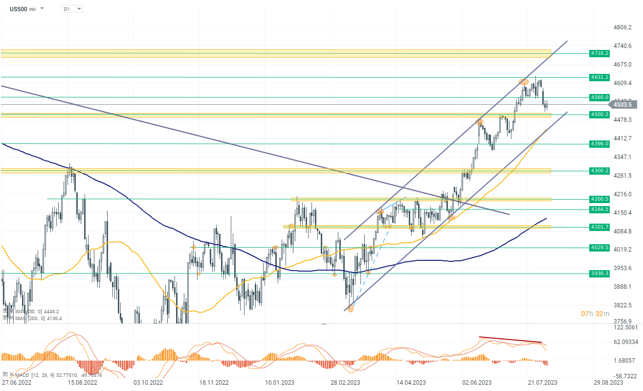 No entanto, uma divergência de baixa no MACD está indicando um potencial abrandamento na dinâmica de alta, um sinal de que o movimento ascendente pode não ser sustentado por muito tempo. Os traders devem manter-se atentos ao próximo nível de suporte em 4500, uma violação aqui poderia sinalizar uma nova correção. No lado positivo, o nível de resistência a ser observado está em 4560 pontos. Este nível poderá ser testado se o atual sentimento positivo continuar. Em geral, os sinais mistos dos indicadores técnicos recomendam uma abordagem cautelosa para o índice US500 neste momento.