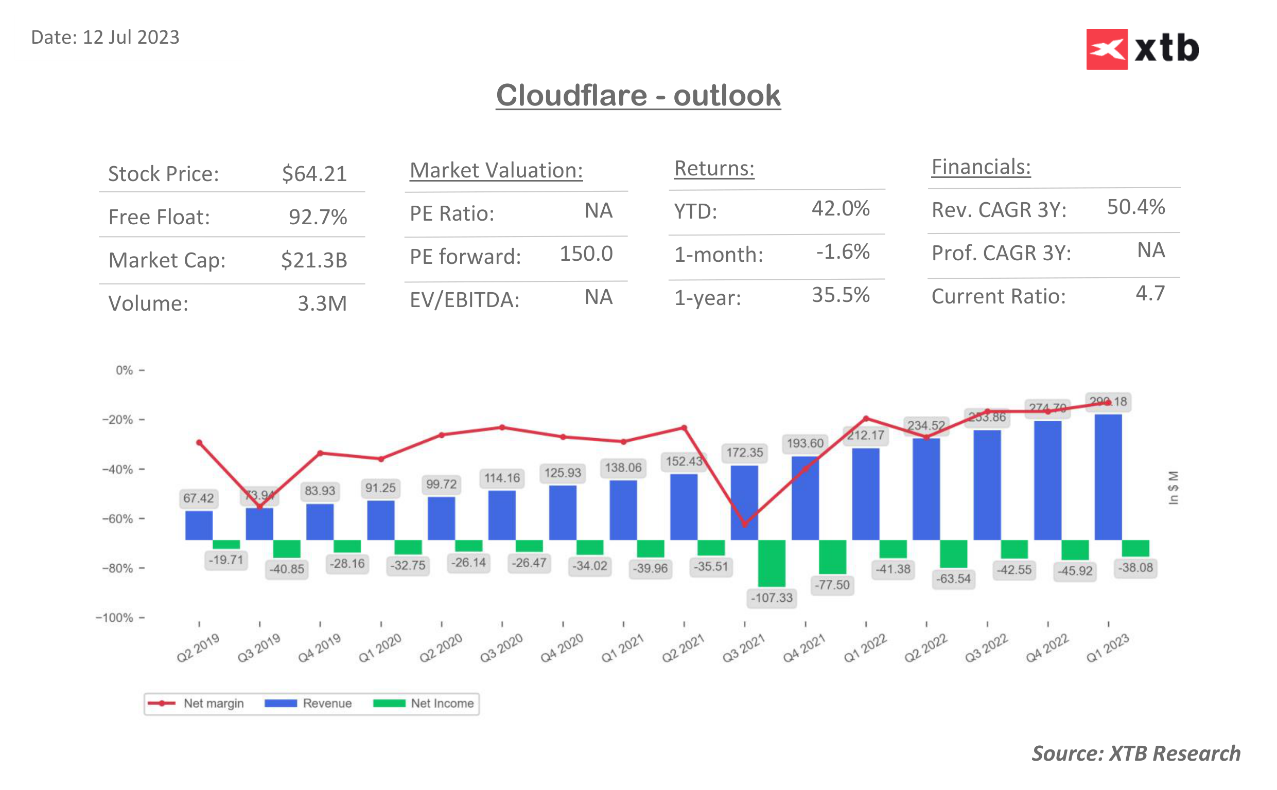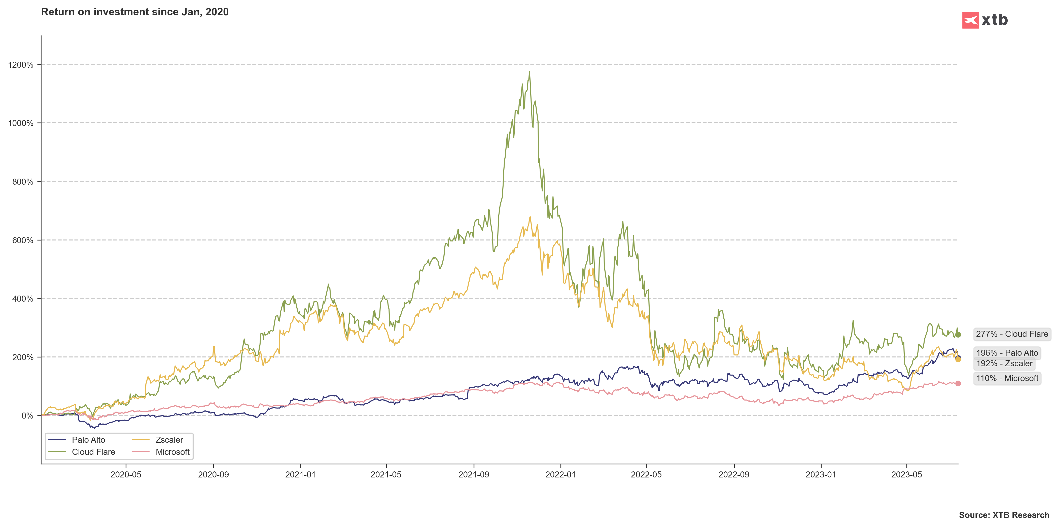 Retorno do investimento em acções no início de 2020, a Microsoft obteve o retorno mais baixo. No entanto, é a maior empresa e um retorno de 110% ainda é impressionante. O oposto pode ser notado nos últimos tempos, quando as acções das restantes empresas diminuem enquanto as da Microsoft estão a ganhar. Além disso, Palo Alto, Zscaler e Cloudflare estão longe de seu ATH alcançado durante o mercado de alta pós-Covid, fonte XTB Research, bloomberg.