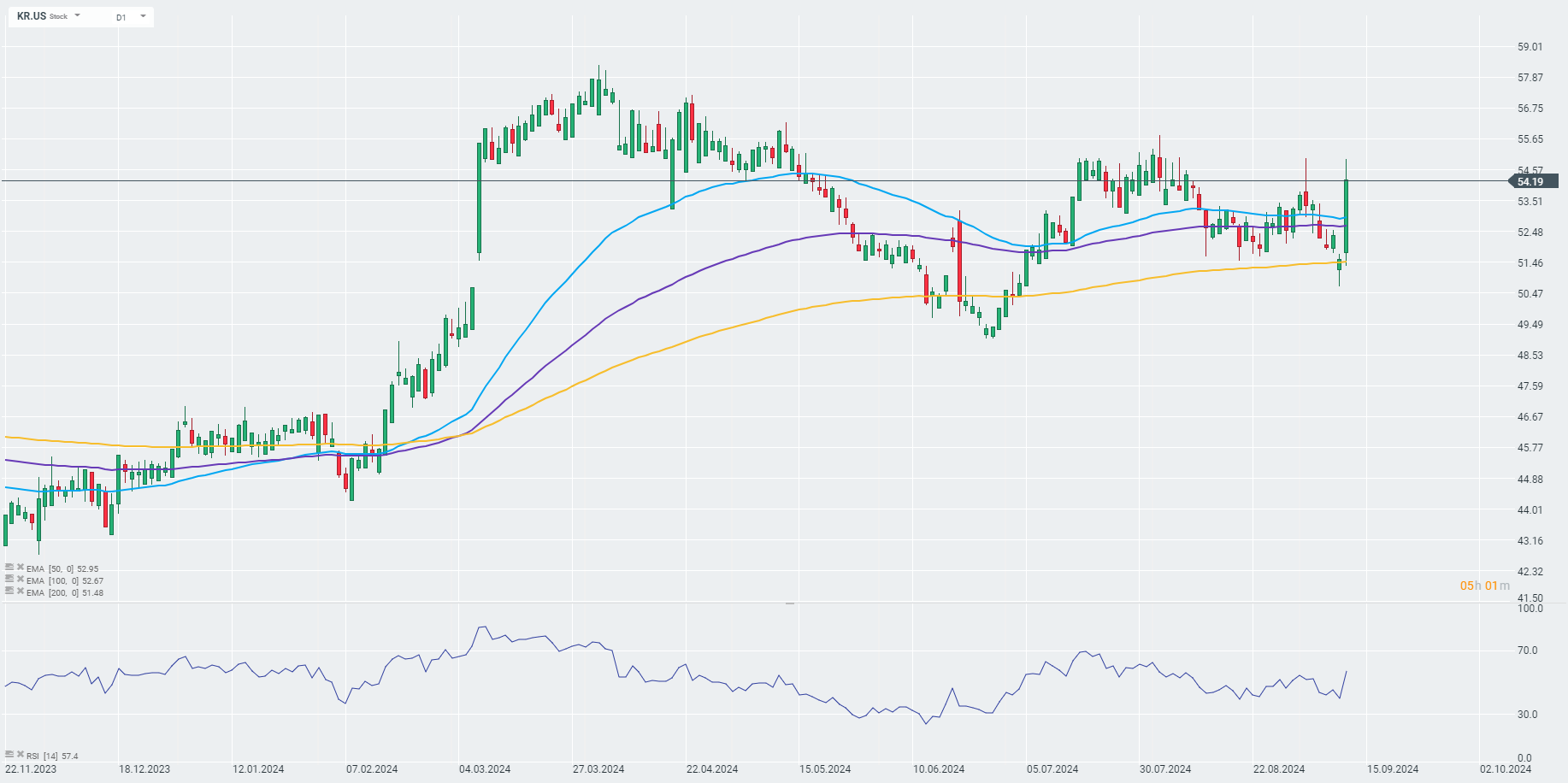 As ações da Kroger (KR.US) estão a subir mais de 5% na sessão de hoje, uma vez que a expansão da margem bruta do operador de mercearias no segundo trimestre correspondeu às expectativas de Wall Street. Curiosamente, a margem bruta mais elevada foi registada apesar das vendas e promoções alargadas dos vários produtos de mercearia oferecidos nas lojas da empresa.