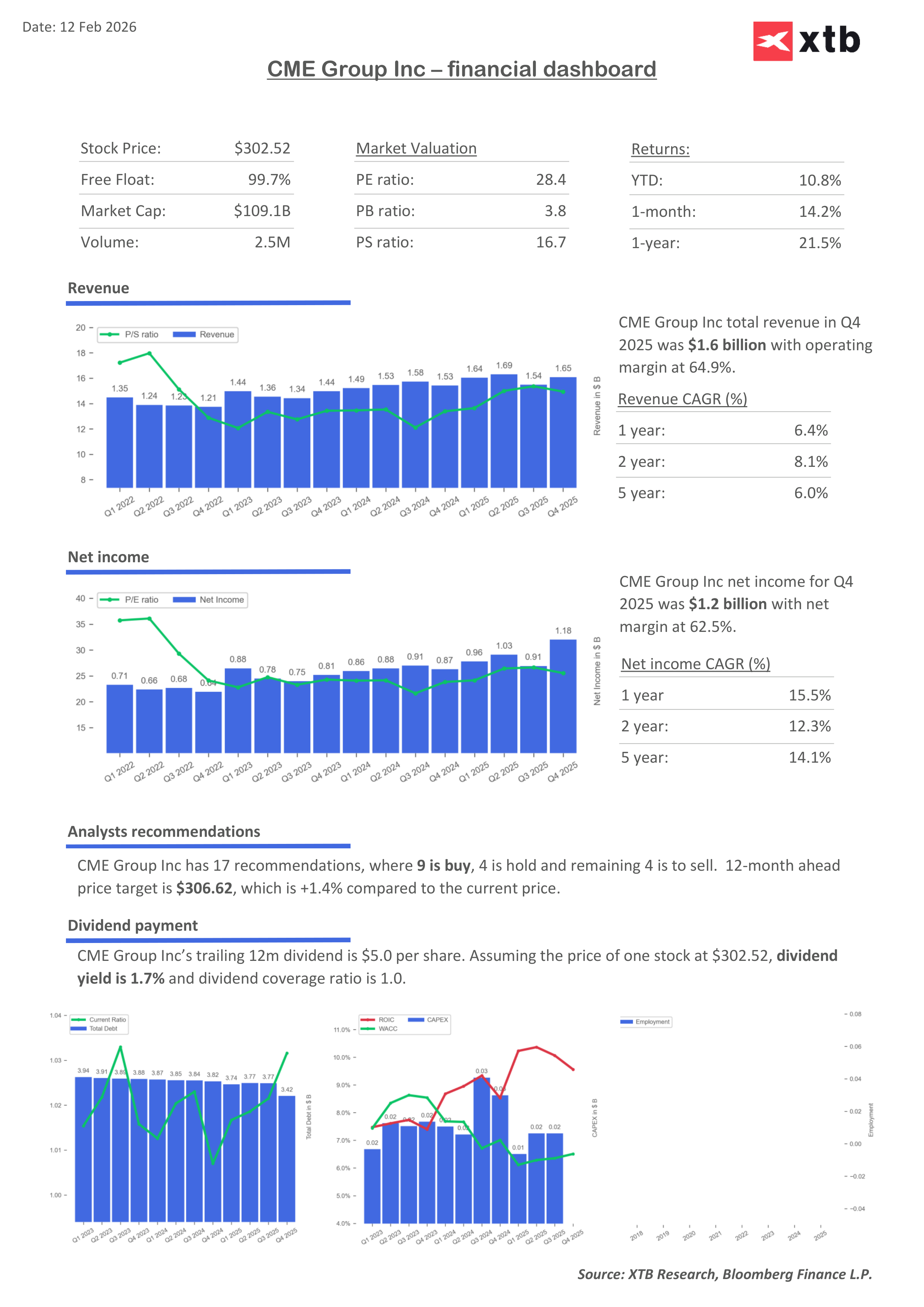 Định giá của CME, xét theo P/E, không quá đắt (P/E khoảng 28, forward P/E khoảng 25), xét đến biên lợi nhuận cao, tăng trưởng tương đối ổn định và tính “phòng thủ” của mô hình kinh doanh – vì doanh thu chủ yếu đến từ khối lượng giao dịch, chứ không phụ thuộc vào hướng đi của thị trường. Trong 5 năm qua, lợi nhuận trung bình tăng khoảng 14%/năm. Nếu duy trì được tốc độ này trong 5 năm tới với biên lợi nhuận tương tự, có thể nói đà tăng của cổ phiếu vẫn chưa tách rời khỏi nền tảng cơ bản. Khoảng cách giữa ROIC và WACC cho thấy công ty đang tạo giá trị cho cổ đông, và CME duy trì mức lợi suất cổ tức trung bình khoảng 2%/năm.