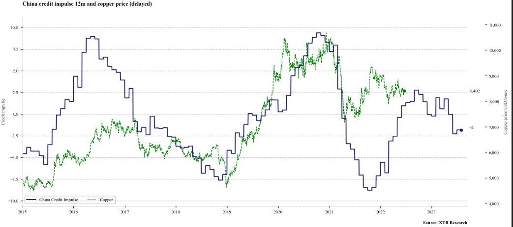Biểu đồ thể hiện giá đồng và xung lực tín dụng cùng mức ảnh hưởng có độ trễ 12-18 tháng với nền kinh tế. Nguồn: Bloomberg Finance LP, XTB