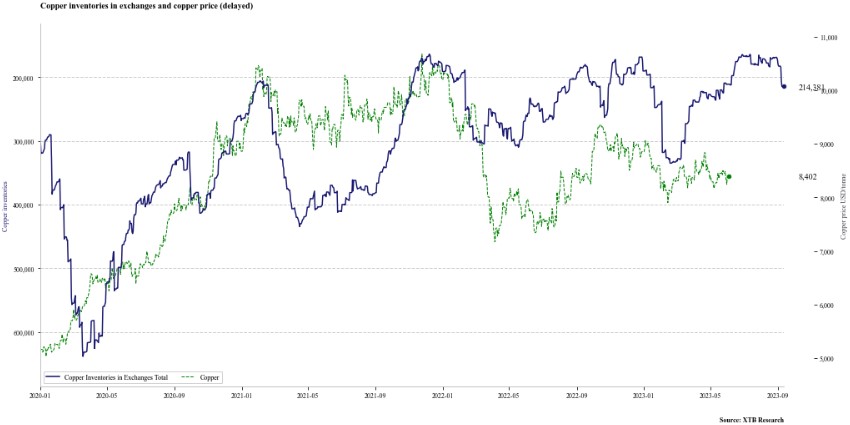 Tồn kho đồng vẫn ở mức thấp dù đã bắt đầu hồi phục (trục ngược). Nguồn: Bloomberg Finance LP, XTB